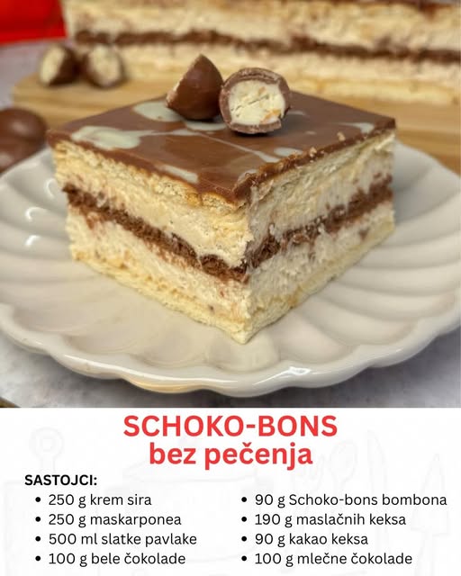 Nakon ukusnih griz knedli, vrijeme je za desert! Šoko torta se ističe svojom bogatom teksturom i neodoljivim ukusima. Ovaj desert je savršena kombinacija Schoko-bons bombona, lagane kreme i hrskave podloge, a pravi se bez pečenja, što ga čini idealnim za svaku priliku. Ova torta je savršen izbor za rođendanske proslave, godišnjice, ili čak kao slatki završetak večere s prijateljima.