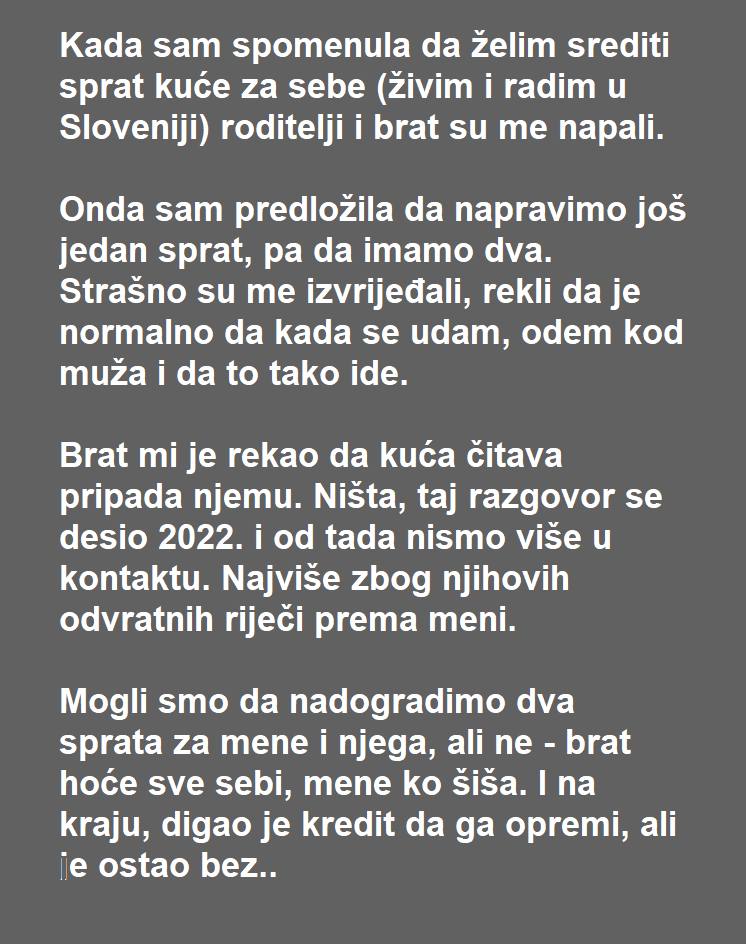 Naša sagovornica je predložila dogradnju kuće kako bi svi članovi porodice, uključujući nju i njenog brata, imali vlastite spratove. Međutim, umjesto da dobije podršku, naišla je na otpor i isključivanje, uz tvrdnje da kuća pripada isključivo njenom bratu. Ova situacija ne samo da postavlja pitanje o pravima na imovinu, već i o rodnim ulogama unutar porodice. Uz to, često se čuje da “žena treba biti zahvalna na onome što ima”, što dodatno komplicira situaciju.
