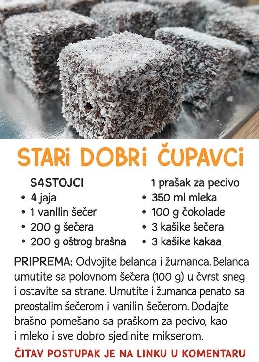Nakon što ste uživali u zdravom desertu, vrijeme je da isprobate još jedan recept koji će vam zasladiti život – Stari Dobri Čupavci. Ove popularne poslastice su poznate po svojoj jednostavnoj pripremi i slasnom okusu. Idealna su kombinacija nježnog keksa, bogatog čokoladnog preljeva i aromatičnog kokosa, što ih čini neodoljivim za ljubitelje slatkiša.